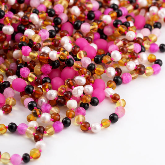 KALUNG AMBER DENGAN PINK FROST AGATE & PEARL UNTUK JUNIOR. JN98-P