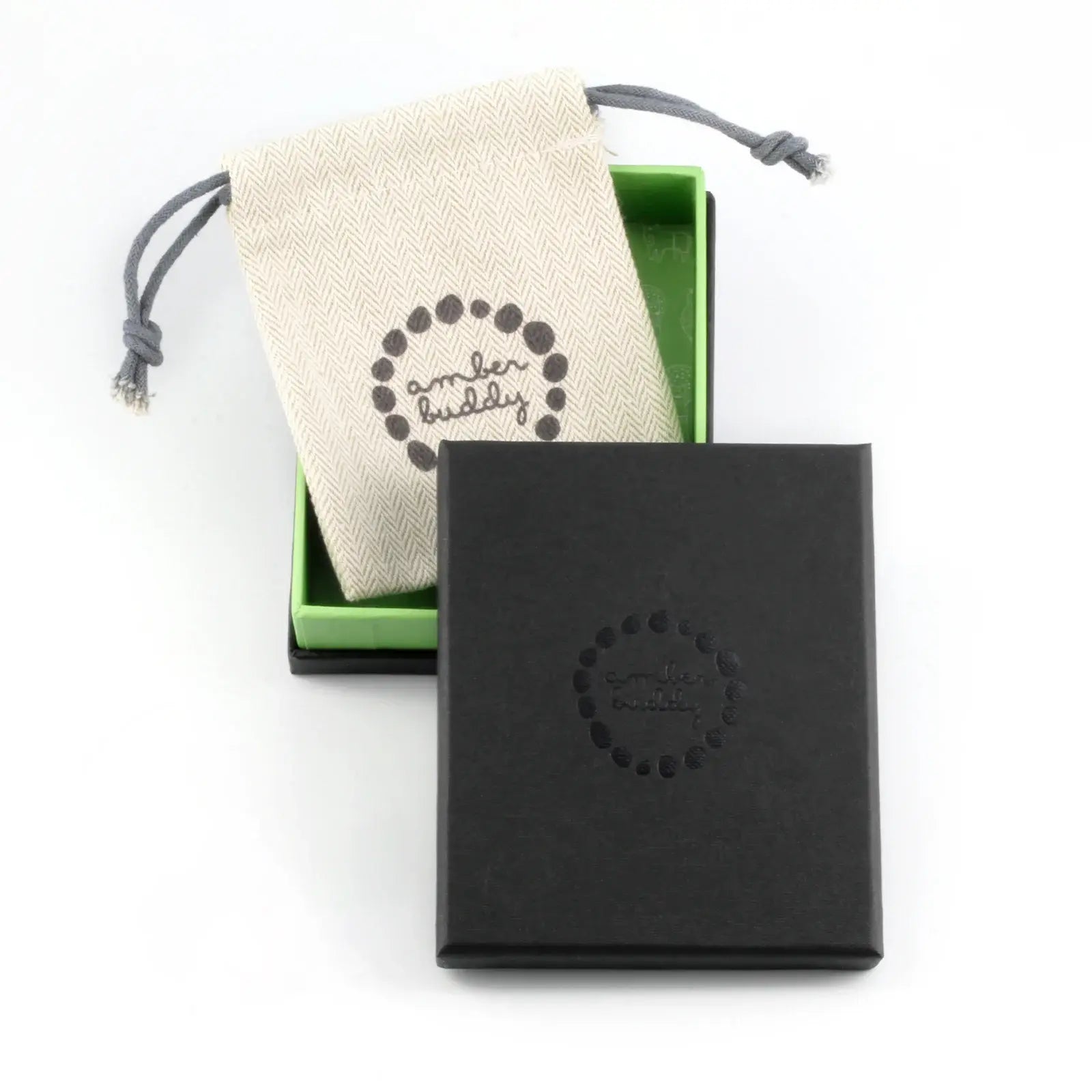 Kemasan dengan brand Amber Buddy dilengkapi dengan kantong katun, kotak hadiah, dan kain pembersih.