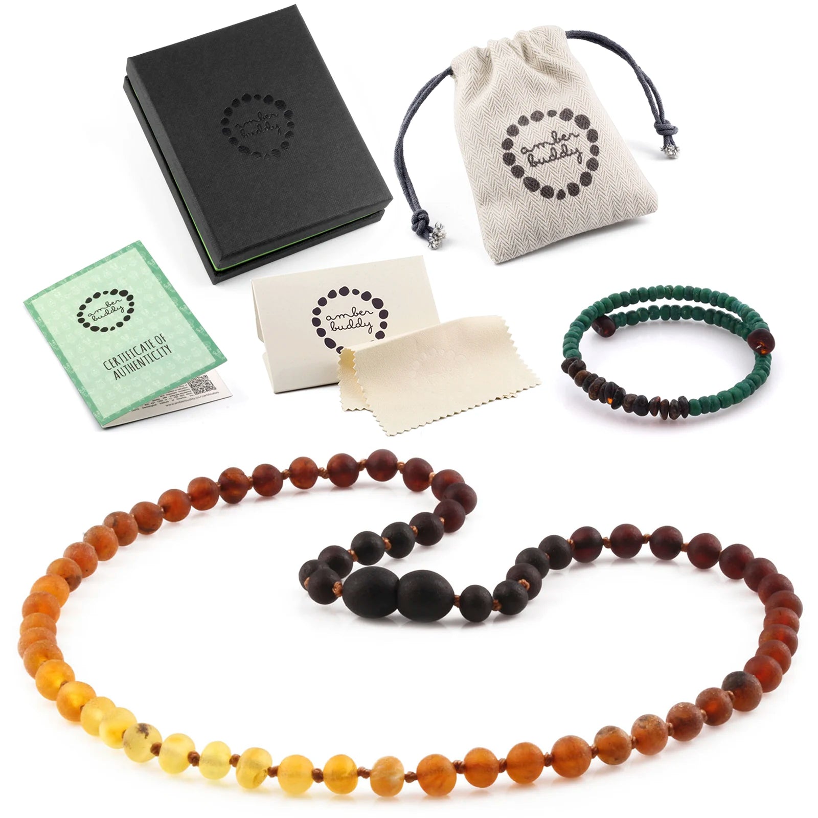 Kemasan dengan brand Amber Buddy dilengkapi dengan kantong katun, kotak hadiah, dan kain pembersih.