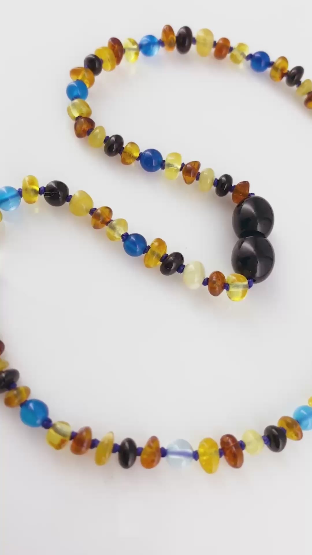 Amber Buddy menggunakan teknik pengikatan dengan dua tali yang membuat kalung lebih tahan lama dan kuat.
